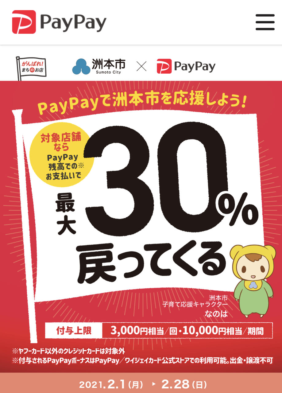 明日・2月1日から1ヶ月間、PayPayキャンペーンが洲本市で開催されます。